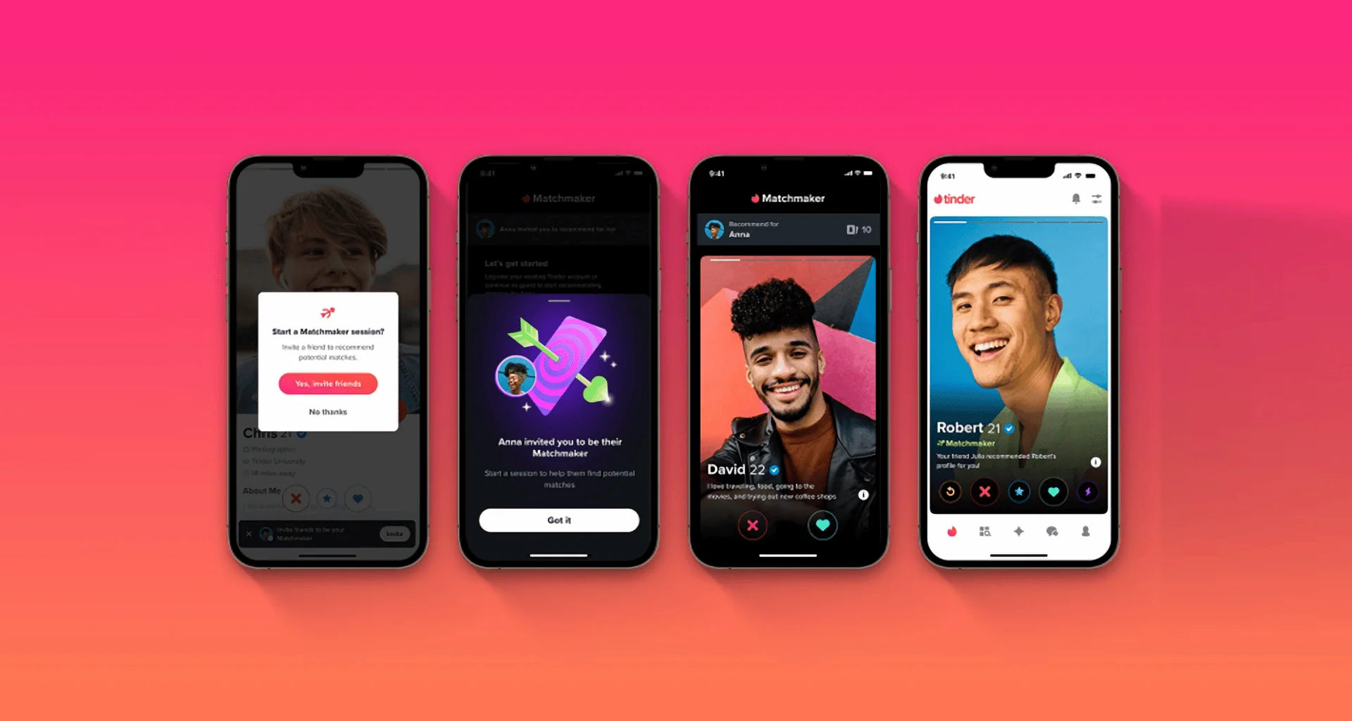 mit dem Namen von Tinder-Matchmaker, Benutzer können Zugriff auf ihre gewähren Tinder für einen Zeitraum von 24 Stunden an andere Personen weiterzuleiten und ihnen so die Möglichkeit zu geben, potenzielle Übereinstimmungen oder Likes vorzuschlagen. Die Idee hinter dieser Funktion besteht darin, Dating eher zu einem „Mannschaftssport“ zu machen, bei dem Freunde und Familie ihre Meinung äußern und Ihnen helfen können, diesen besonderen Menschen zu finden. Denn wer wollte schon nie jemandes Amor sein?